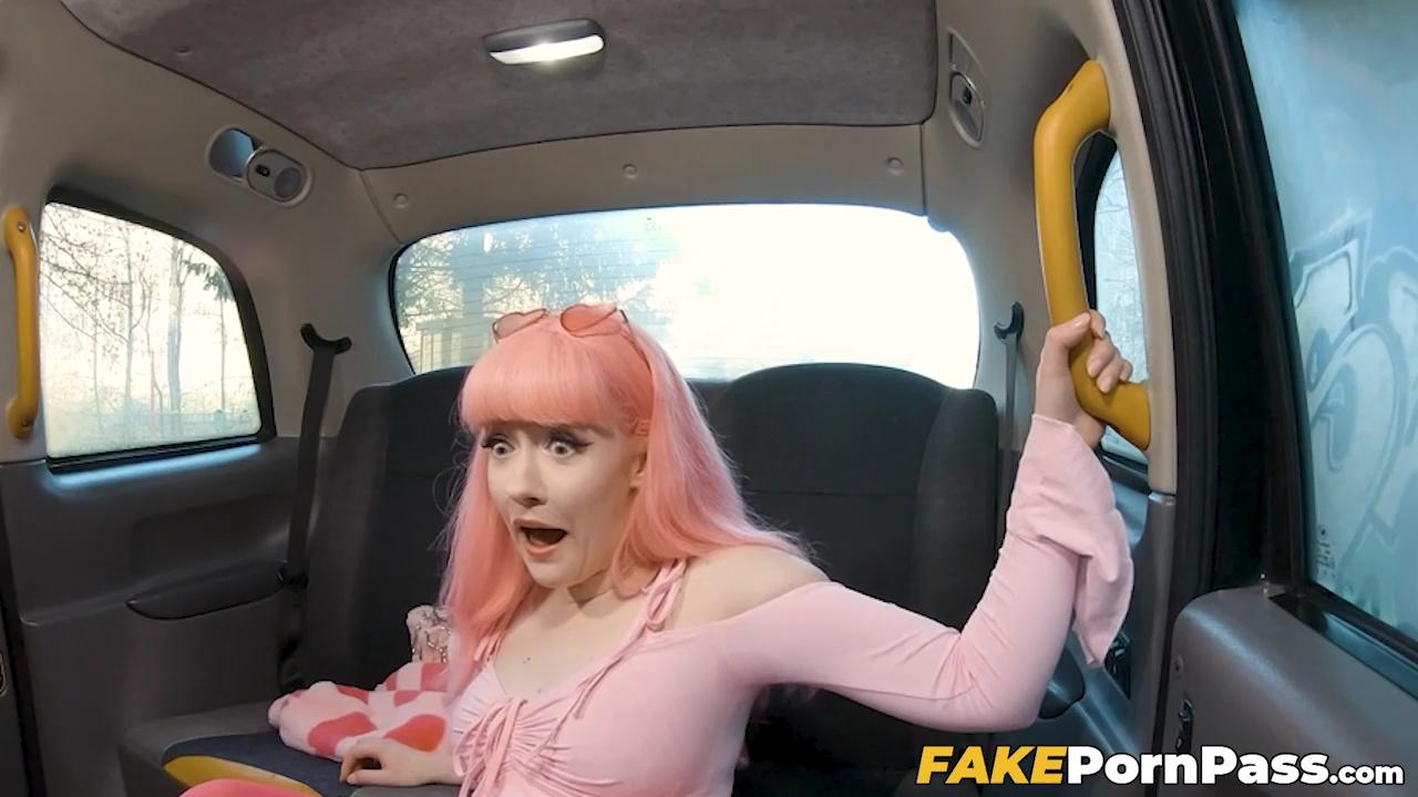 Busty pink-haired babe Evie Rees deepthroats a huge cock in the backseat of a taxi. She grinds on it hard in reverse cowgirl, moaning loudly. He cums inside her perfect trimmed pussy, creating a creampie.
