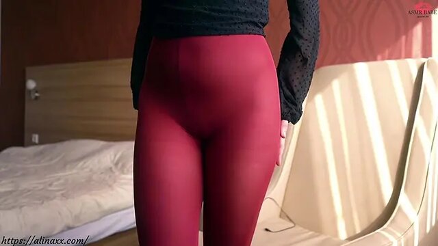 Sensual red nymph in pantyhose teases with dildo and feet