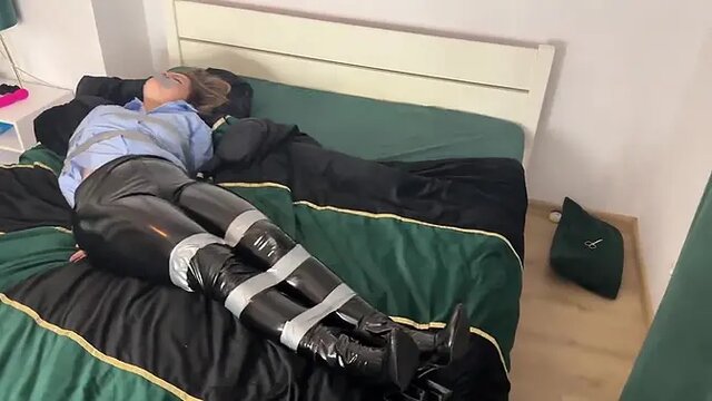 A sexy office secretary is tied up with duct tape, struggling to escape. Her wrists and ankles are tightly bound, leaving her completely helpless. She is then taken from behind by a dominant figure who fucks her hard, proving that she's nothing more than his obedient slave girl.